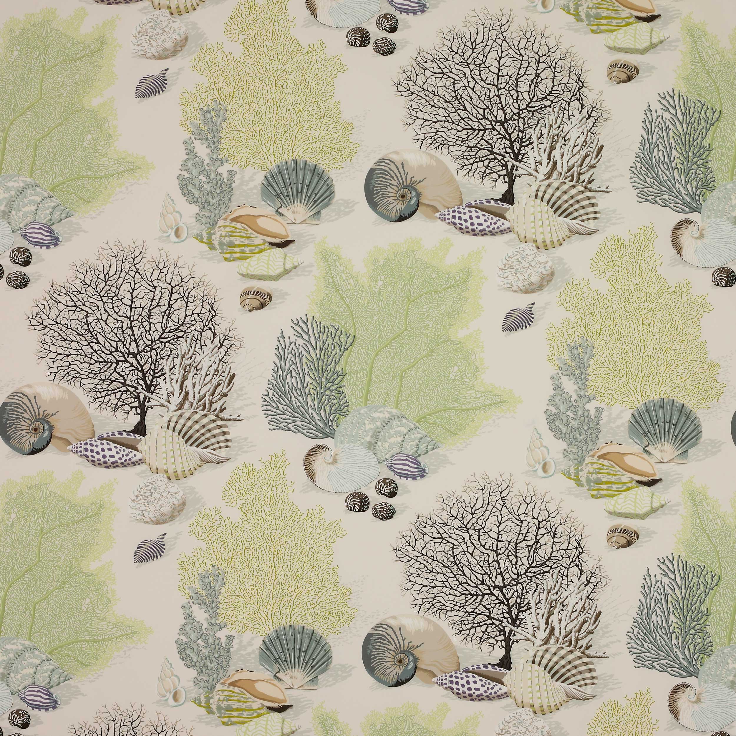Cet imprimé s’inspire de la beauté de Byron Bay et des plages australiennes avec des feuillages et des coquillages marins exotiques. Également disponible en papier peint.