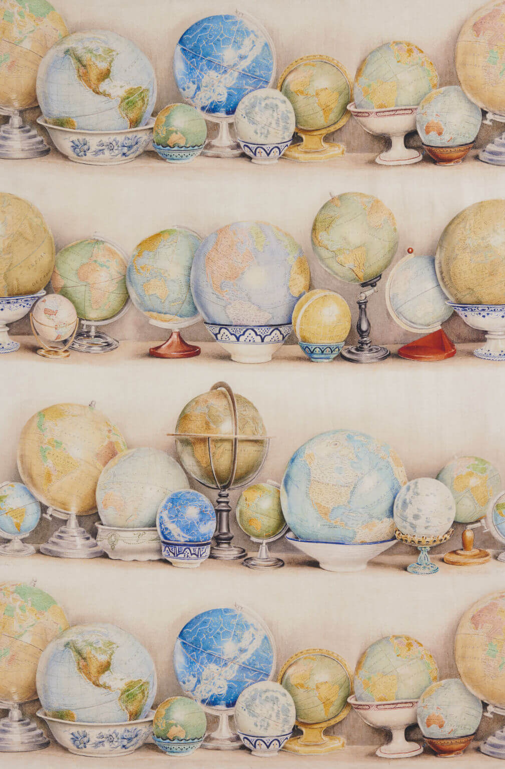 Cette toile de lin imprimée à l’esprit vintage présente une collection de globes terrestres et célestes de tailles et d’époques différentes. Jean-Pierre Marladot est l’auteur de ce délicat dessin