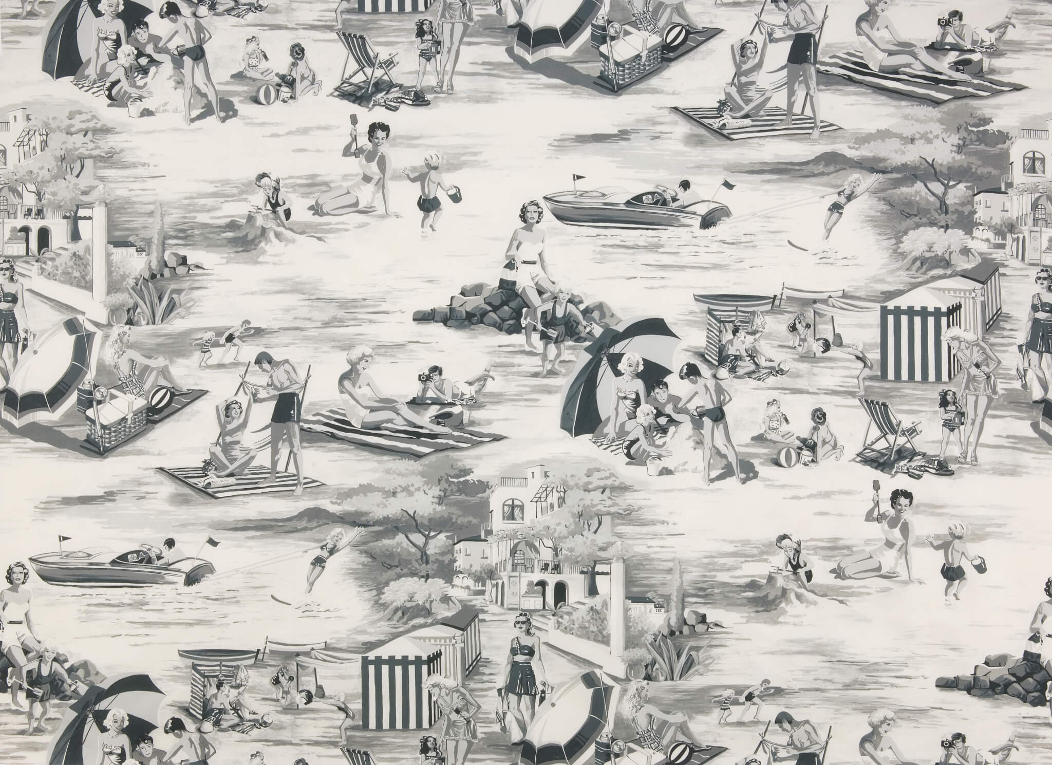 Hommage amusé aux catalogues des années 50 relatant les vacances au bord de l’eau sur une toile de coton.