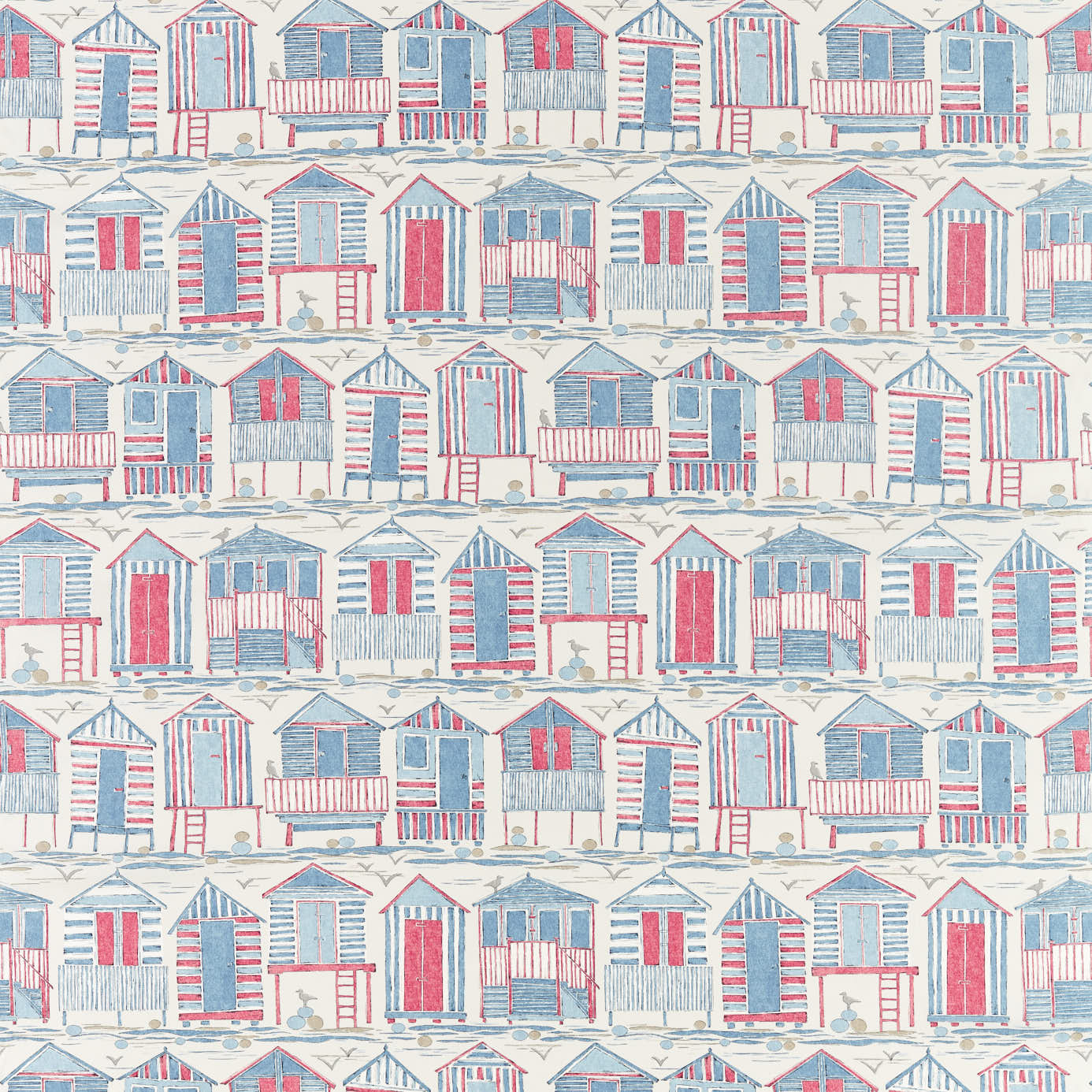 Ce tissu en coton mélangé, représente des cabanes de plage emblématiques dans toutes leurs formes et tailles, rappelant des jours d’enfance passés au bord de la mer britannique.