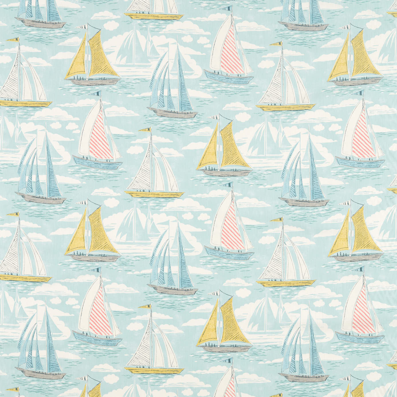 Cet imprimé est inspiré les voiliers de Cornouailles rentrant au port pittoresque de Port Isaac. il représente des croquis stylisés des bateaux flottant sur une mer ondoyante entrecoupée de nuages délicats.