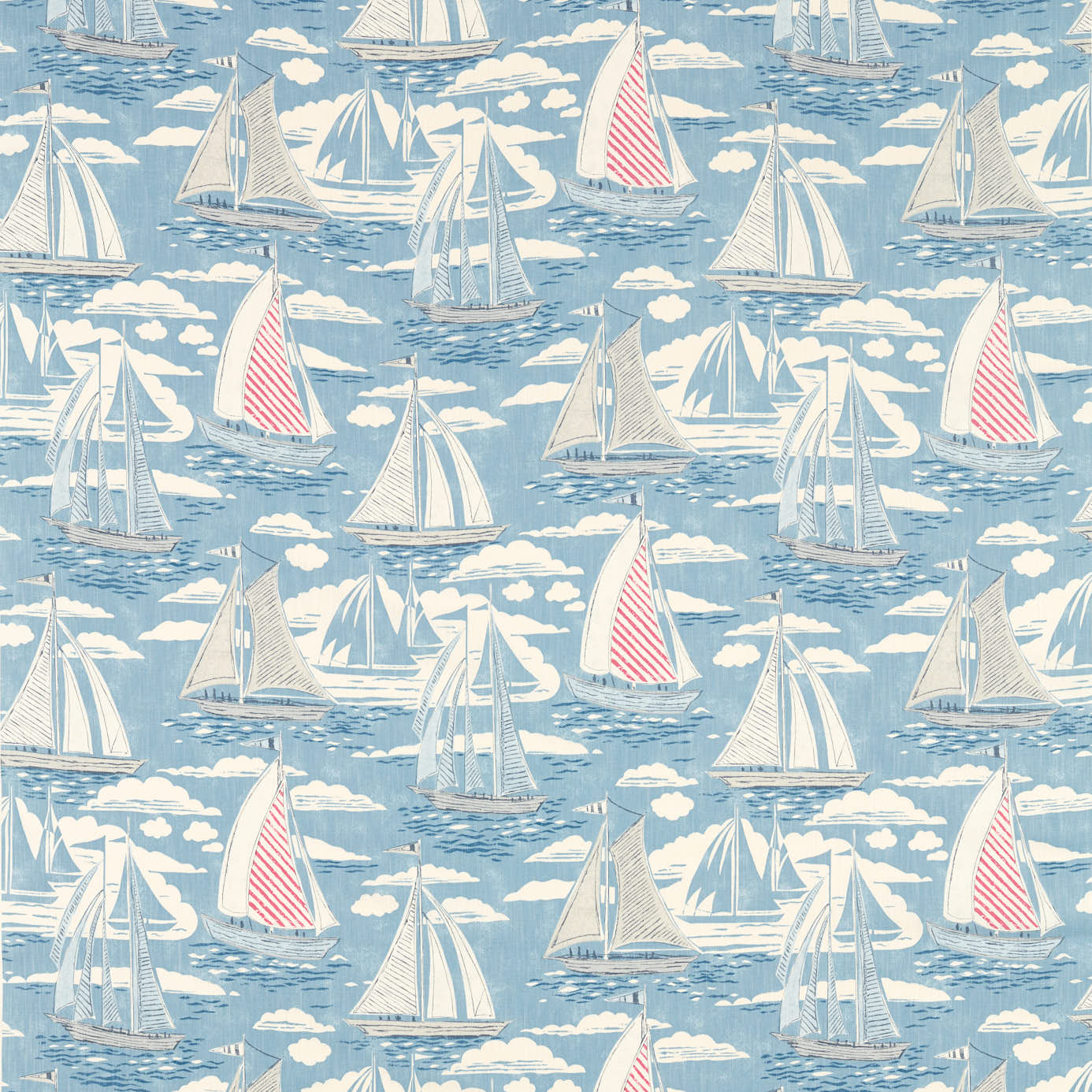 Cet imprimé est inspiré les voiliers de Cornouailles rentrant au port pittoresque de Port Isaac. il représente des croquis stylisés des bateaux flottant sur une mer ondoyante entrecoupée de nuages délicats.
