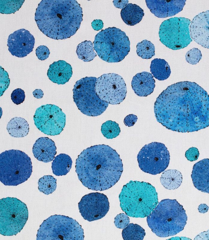 Prune Cirelli signe ces coquilles d’oursins en variations de bleus du turquoise à l’outremer sur coton clair et lumineux ou sombre et profond. Un thème estival qui sent bon les vacances ! Retrouvez tous les modèles créés par l’illustratrice au fil du temps pour la maison Thévenon. 2316601