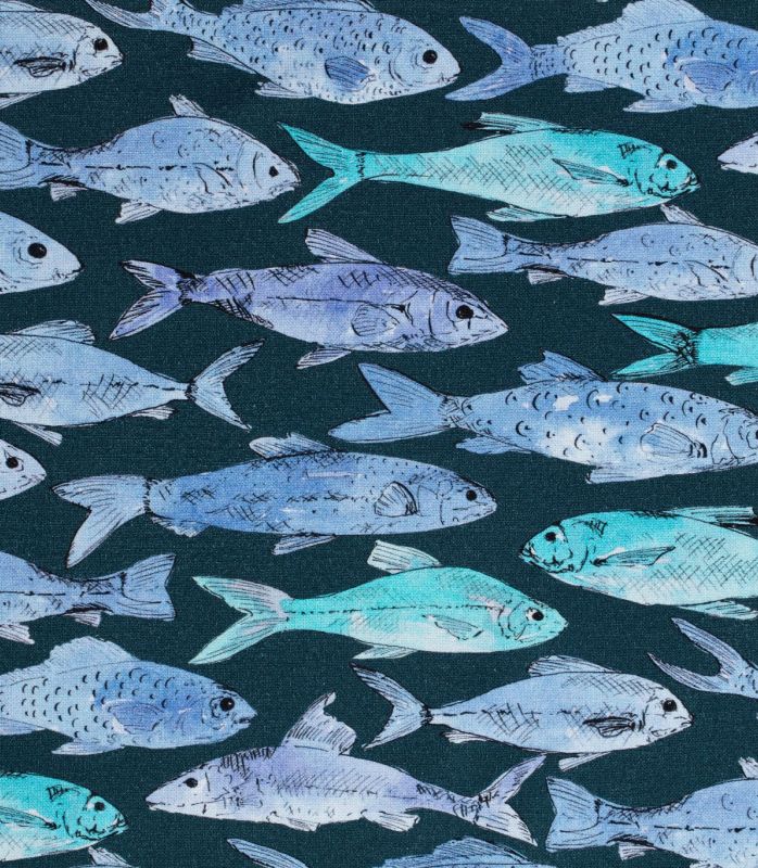 Prune Cirelli étoffe sa gamme de motifs créés pour la maison Thévenon avec ces poissons serrés, nageant suivant deux directions horizontales inversées, alliant la légèreté des encres bleues aquarellées et la précision efficace d’un trait noir pour définir contours et détails. 2315602