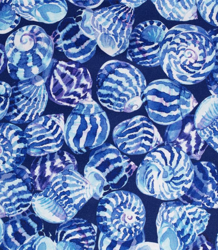 En camaïeux de bleus de faïence ou en dégradés safranés sur fond de lagon cristallin, des coquillages tout en rondeurs roulent les uns contre les autres, et revisitent la traditionnelle décoration de bord de mer par l’effet de densité et les zébrures des motifs. 2317602