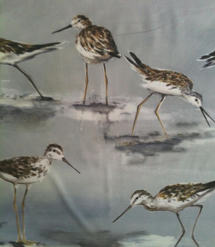 Les territoires de bords de mer ne sont pas le monopole des poissons et crustacés, comme nous le rappellent ces joyeux échassiers qui barbotent sur le rivage. Une toile de coton aux tons relativement neutres au traitement très peinture. 1374621
