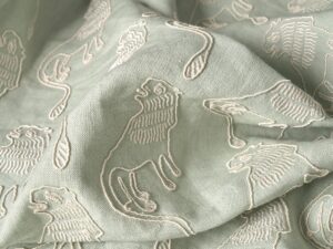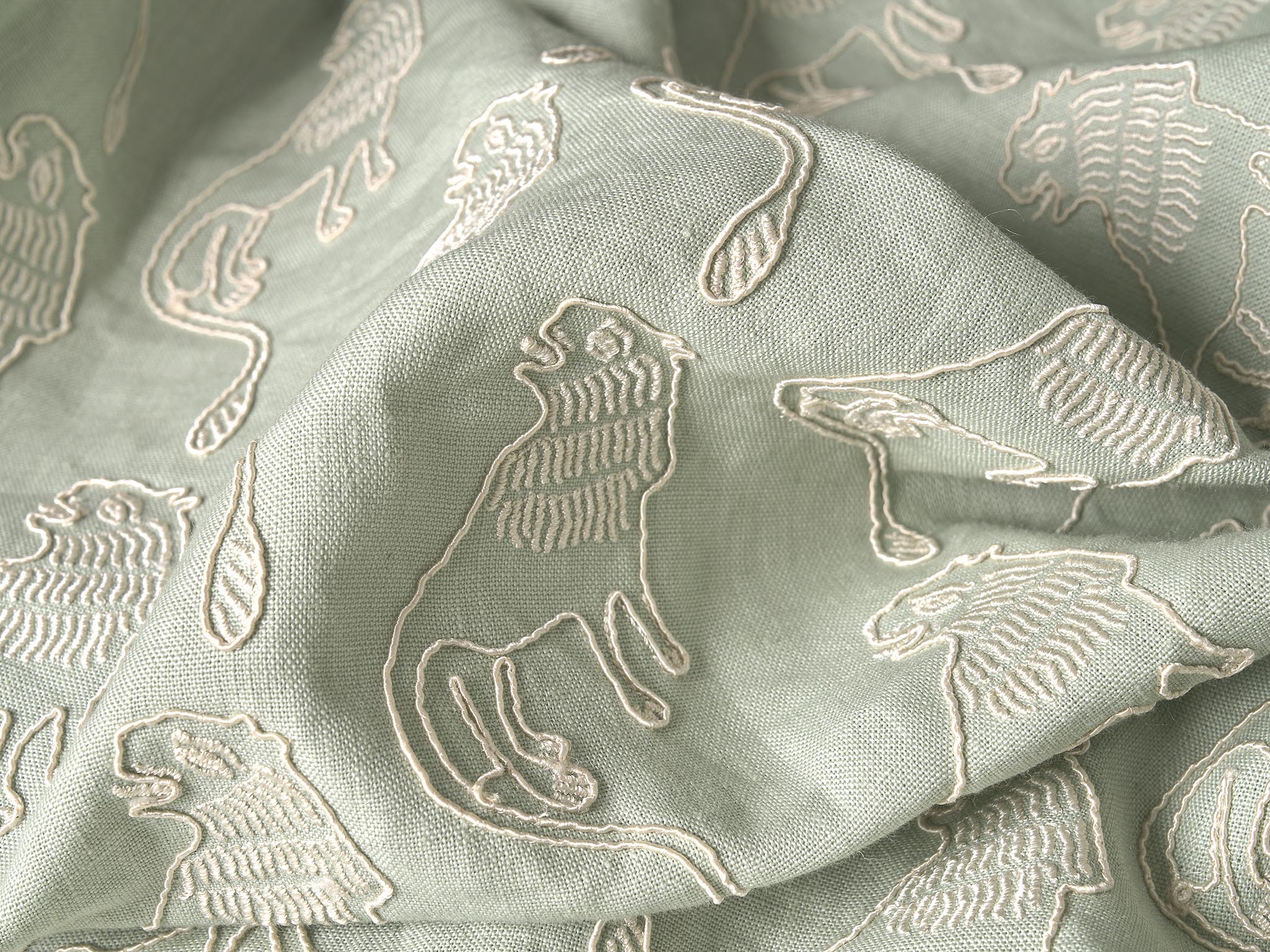 Réinterprétation d’un détail d’un Kalemkar issu des archives de la Maison, ce motif de lions stylisés originellement imprimé à la planche de bois est ici réinterprété en une broderie au lustre nacré et au relief subtil sur une magnifique toile de lin. Existe également en papier peint.